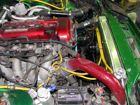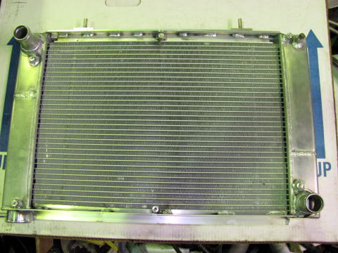 今回のエビスサーキットで冷却とウエストゲートの高ブーストをテストするのに前日徹夜で作業します。 終わったのは当日朝8時でしたが・・・。 作業工程 流用アルミラジエータを加工します。 ホース口サイズ変更、仕切り板を2枚入れてトリプルターン式へ変更。 |