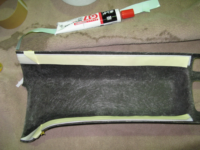 両面テープを張り付ける所にボンドG17を散布して半乾きで両面テープを貼ります。 画像を参考にして下さい。 両面テープを淵まで寄せると取り付けたときに段差が多くなるので少し内側にします。 |