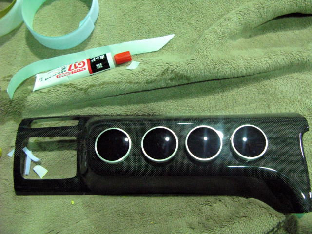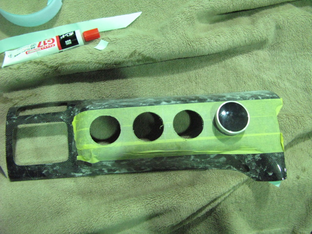 | 追加メーター取り付けのパネルにマスキングテープを貼りメーター取り付け位置を検討します。 表面を保護する役目も兼ねています。 |